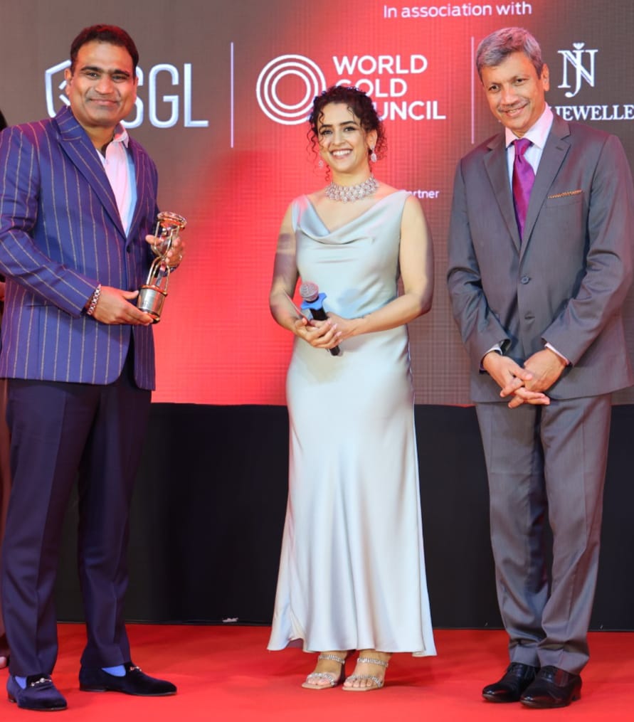 ഫ്യൂറ റീട്ടെയ്ൽ ജൂവലർ ഇന്ത്യ അവാർഡ്സിൽ കല്യാൺ ജൂവലേഴ്സിൻറെ സെലിബ്രേറ്റിംഗ്എവരിഇന്ത്യൻ എന്ന ദീപാവലി പ്രചാരണ പരിപാടിക്ക് ലഭിച്ച മികച്ച ടിവി പ്രചാരണത്തിനുള്ള പുരസ്കാരം കല്യാൺ ജൂവലേഴ്സ് എക്സിക്യൂട്ടീവ് ഡയറക്ടർ രാജേഷ് കല്യാണരാമൻ വേൾഡ് ഗോൾഡ് കൗൺസിൽ ഇന്ത്യ മാനേജിംഗ് ഡയറക്ടർ സോമസുന്ദരത്തിൽ നിന്നും ഏറ്റുവാങ്ങുന്നു. നടി സാനിയ മൽഹോത്ര സമീപം