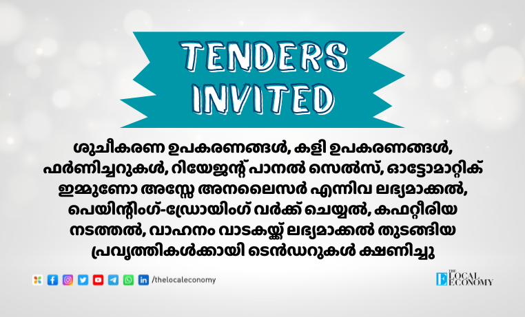 ശബരിമല തീർഥാടനവുമായി ബന്ധപ്പെട്ട് സന്നിധാനം, പമ്പ, നിലയ്ക്കൽ, പന്തളം, കുളനട എന്നിവിടങ്ങളിൽ ആവശ്യമായ ശുചീകരണ ഉപകരണങ്ങളും വിശുദ്ധി സേനാംഗങ്ങൾക്ക് വേണ്ട ഈർക്കിൽ ചൂൽ, റെയിൻ കോട്ട്, യൂണിഫോം, പുതപ്പ്, റബർ ഗ്ലൗസ് തുടങ്ങിയ സാധനസാമഗ്രികളും വിതരണം ചെയ്യുന്നതിന് ടെൻഡർ ക്ഷണിച്ചു. അവസാന തീയതി ഒക്ടോബർ 18 വൈകിട്ട് അഞ്ച്. ഫോൺ: 04734 224827.
