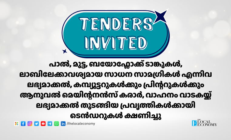 മണ്ണുത്തി സംസ്ഥാന ബയോ കൺട്രോൾ ലാബിൽ ജൈവ നിയന്ത്രണ ഘടകങ്ങളുടെ ഉത്പാദനത്തിനായി സ്ഥാപിച്ചിട്ടുള്ള ഹൈടെൻഷൻ വൈദ്യുതി ഇൻസ്റ്റലേഷനുകളുടെ ദൈനംദിന പ്രവർത്തനങ്ങൾക്കും പരിപാലനത്തിനുമുള്ള വാർഷിക പരിപാലന കരാറിനായി ടെണ്ടർ ക്ഷണിച്ചു. നവംബർ പത്തിന് ഉച്ചയ്ക്ക് 12.30 വരെ ടെണ്ടർ സമർപ്പിക്കാം. കൂടുതൽ വിവരങ്ങൾക്ക് ഓഫീസുമായി നേരിട്ട് ബന്ധപ്പെടുക. വെബ്സൈറ്റ്: www.kerala.gov.in. ഫോൺ: 0487 2374605.