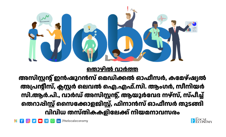 അസിസ്റ്റന്റ് ഇൻഷുറൻസ് മെഡിക്കൽ ഓഫീസർ, കമേഴ്ഷ്യൽ അപ്രന്റീസ്, ക്ലസ്റ്റർ ലെവൽ ഐ.എഫ്.സി. ആംഗർ, സീനിയർ സി.ആർ.പി., വാർഡ് അസിസ്റ്റന്റ്, ആയുർവേദ നഴ്സ്, സ്പീച്ച് തെറാപ്പിസ്റ്റ് സൈക്കോളജിസ്റ്റ്, ഫിനാൻസ് ഓഫീസർ തുടങ്ങി വിവിധ തസ്തികകളിലേക്ക് നിയമനാവസരം...