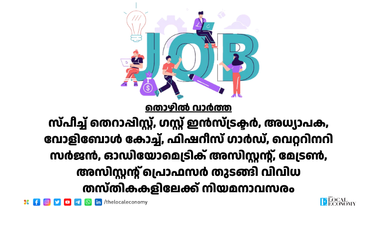 സ്പീച്ച് തെറാപ്പിസ്റ്റ്, ഗസ്റ്റ് ഇൻസ്ട്രക്ടർ, അധ്യാപക, വോളിബോൾ കോച്ച്, ഫിഷറീസ് ഗാർഡ്, വെറ്ററിനറി സർജൻ, ഓഡിയോമെട്രിക് അസിസ്റ്റന്റ്, മേട്രൺ, അസിസ്റ്റന്റ് പ്രൊഫസർ തുടങ്ങി വിവിധ തസ്തികകളിലേക്ക് നിയമനാവസരം...